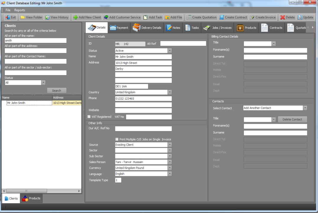 A fully featured database of clients and suppliers