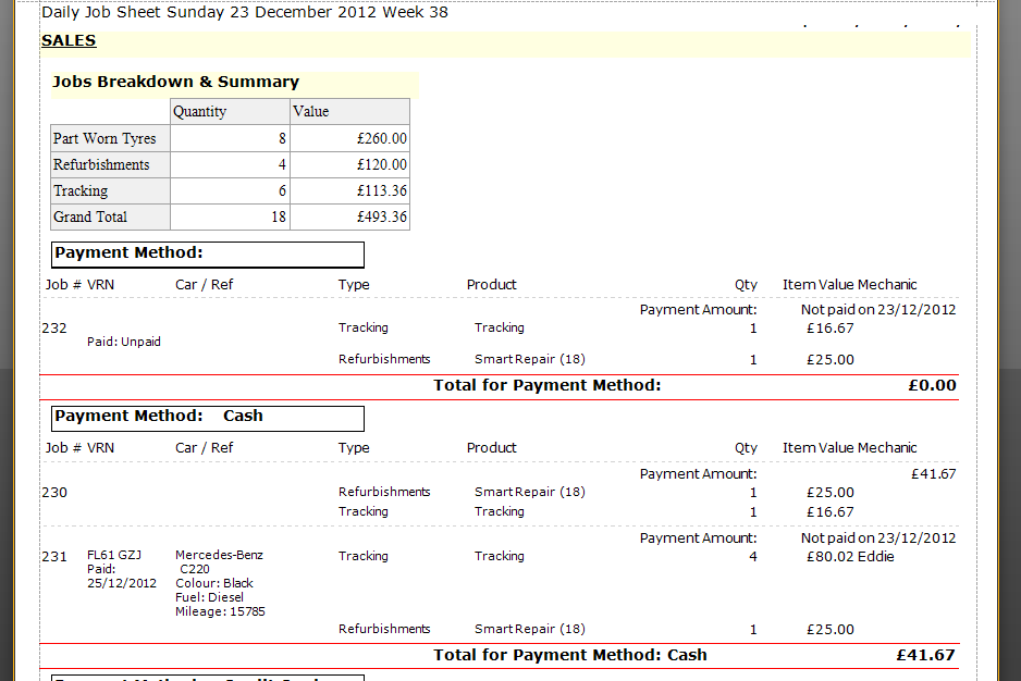 Daily job Sheet showing jobs completed and cash in and out of the business