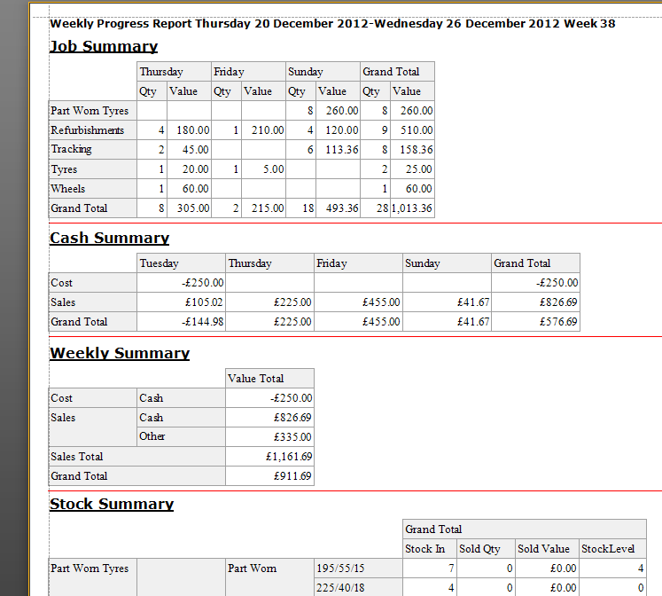 Weekly Summary Report showing a summary of the number and values of all jobs in the week