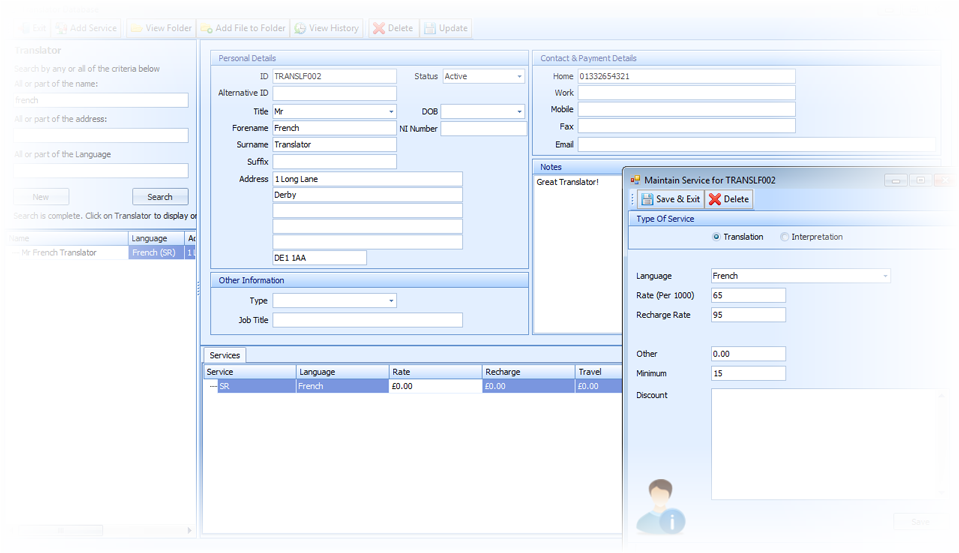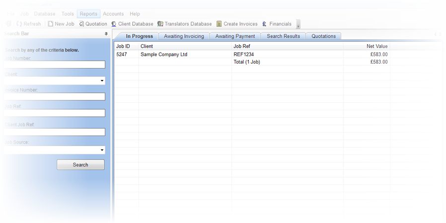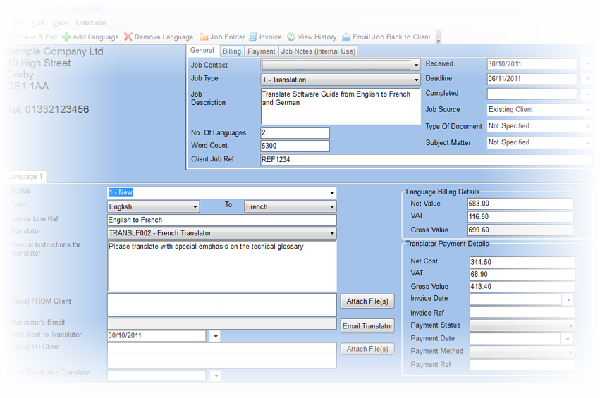 Record all pertinent details of a job ( client, languages, translators, cost, value, special instructions, notes